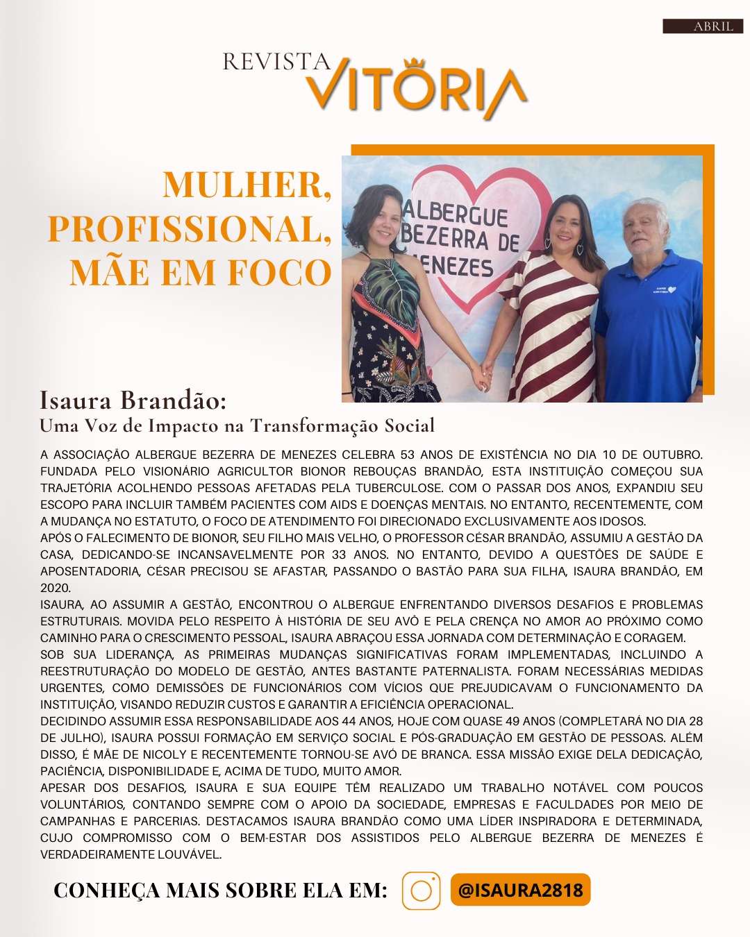 Mulheres em Foco Mulher, Profissional, Mãe em Foco Isaura Brandão: Uma voz de impacto na transformação social. By Revista Vitória Last updated 8 maio, 2024 173 0 0 173 Share FacebookTwitterGoogle+ReddItWhatsAppPinterestO email