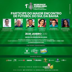 Está chegando o dia do primeiro Workshop de Jornalismo Esportivo do Sul da Bahia, uma realização da MR Eventos, no Centro de Convenções de Ilhéus. Evento acontece no dia 26, a partir das 8 da manhã, e apresentará para  comunicadores, profissionais de futebol, estudantes e público apaixonado como é o mundo do futebol através das gestões, coberturas esportivas, bastidores e outros temas.
