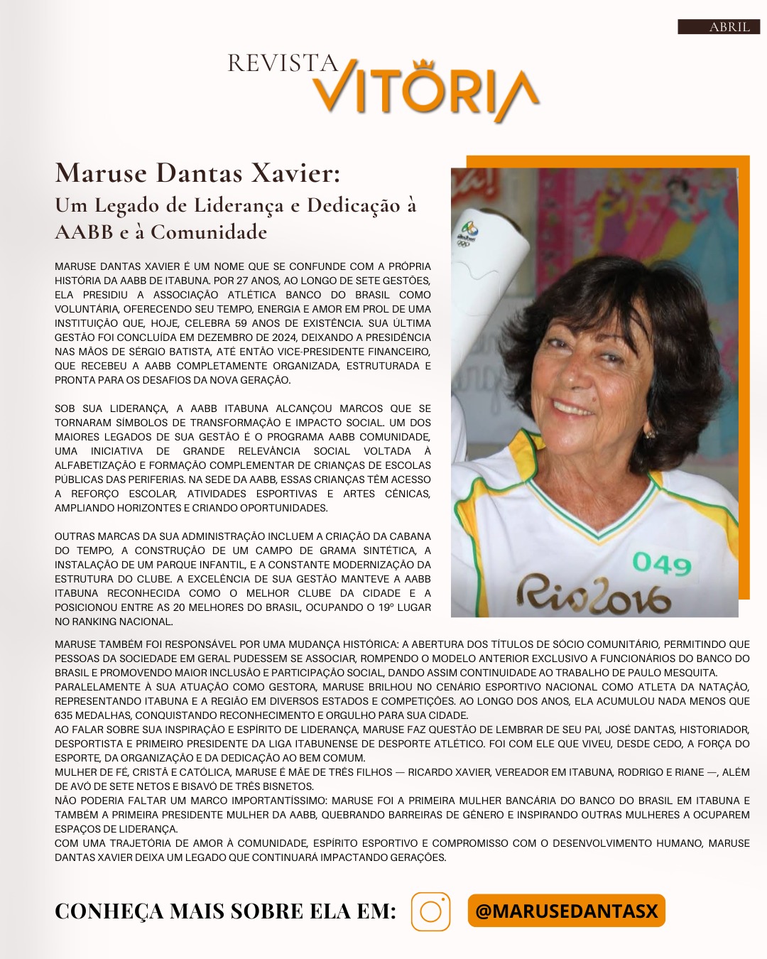 Sem categoria Maruse Dantas Xavier: Um legado de liderança e dedicação a AABB e a comunidade. By Revista Vitória Last updated 26 abr, 2025 246 0 0 246 Share FacebookTwitterGoogle+ReddItWhatsAppPinterestO email